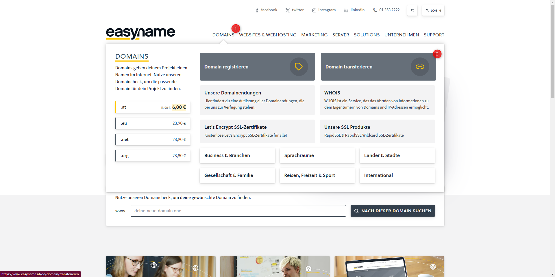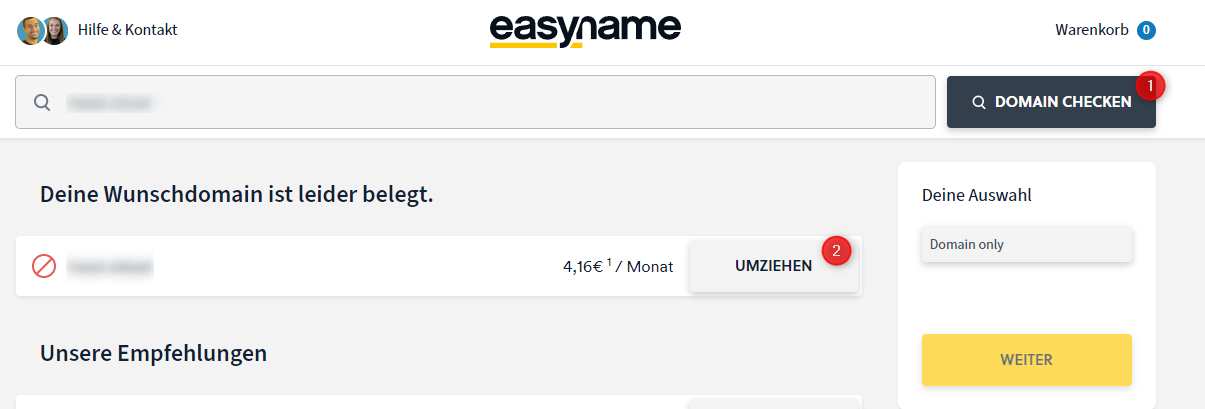 Now you can enter the desired domain name that you want to transfer to easyname. By clicking [Check domain], our ordering system will inform you that this domain is already registered and offer to [Transfer] it to us.