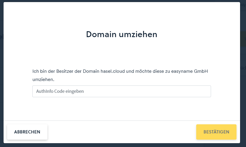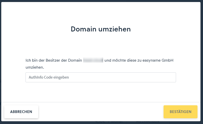 By clicking this button, you will be prompted to enter the AuthInfo code. By clicking the yellow [Confirm] button, the domain transfer will be started.