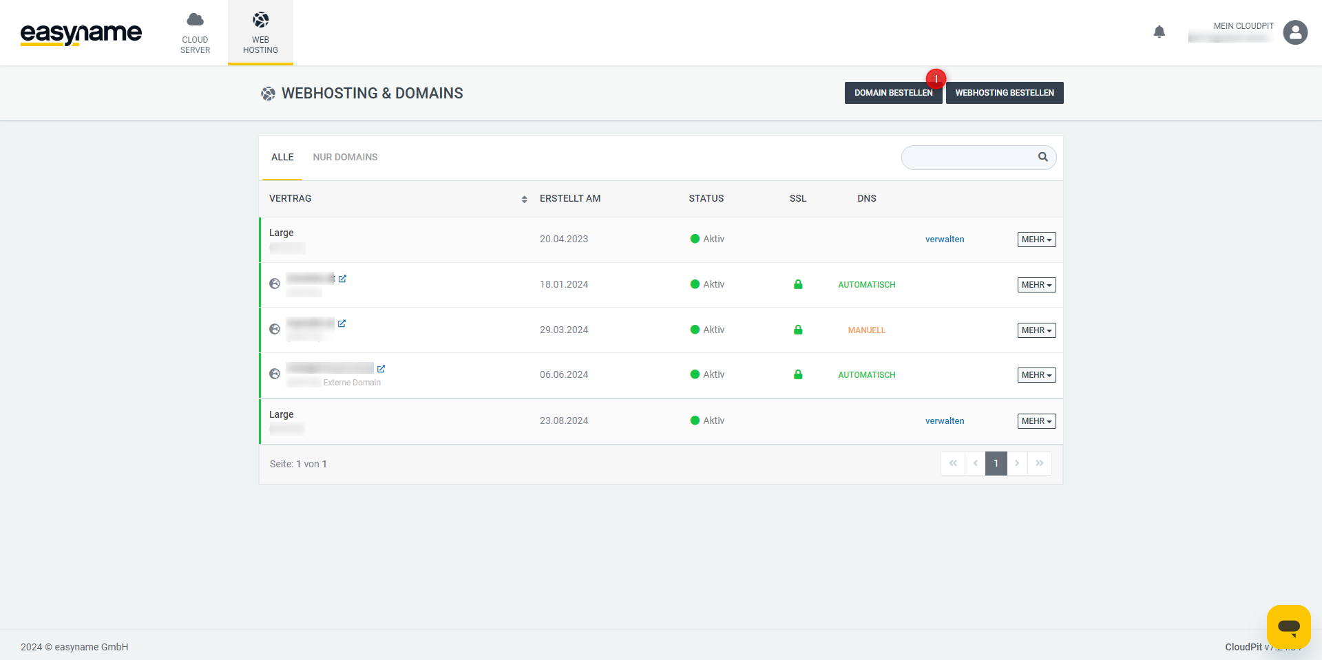 To start a domain transfer directly in CloudPit, click on the [Order domain] button in the overview of your active web hostings and domains.