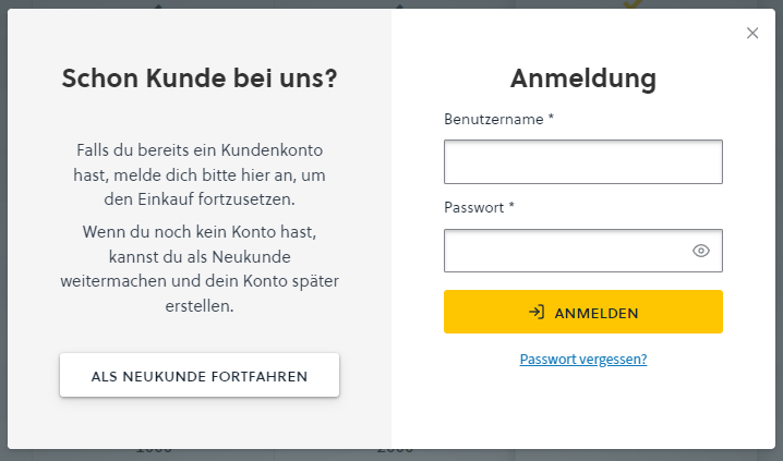 Navigate to the desired product and click on [Order] – this will open the login form, which also gives you the option to [Continue as a new customer]. Click on this option to start the registration process.