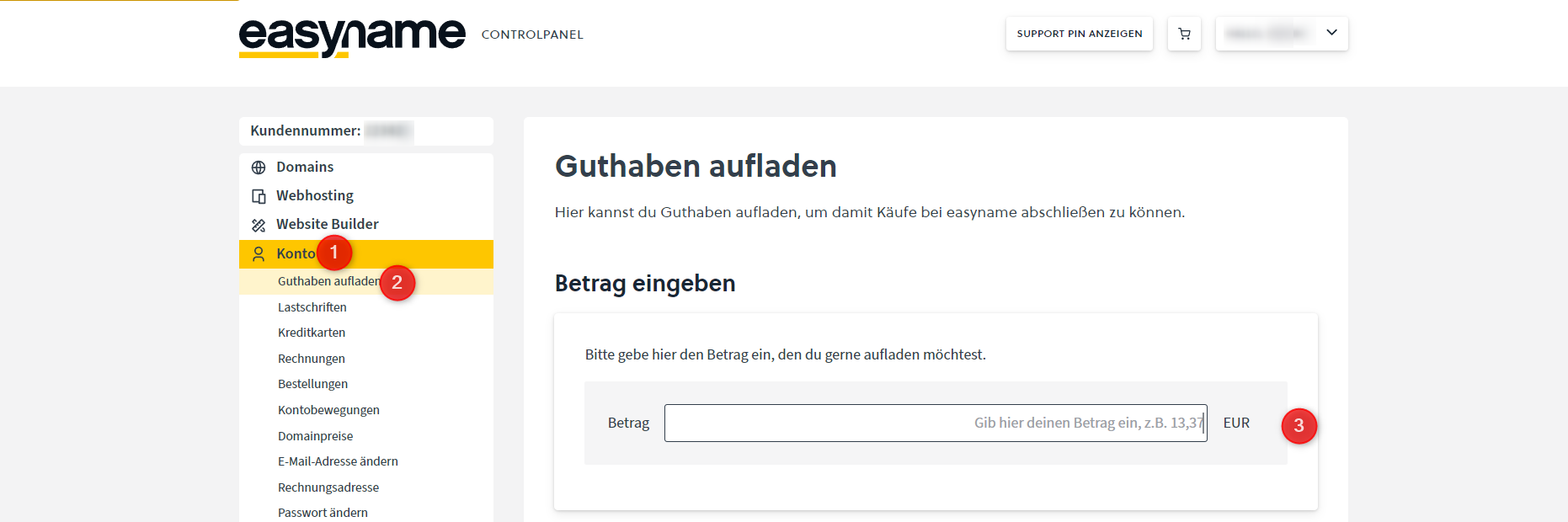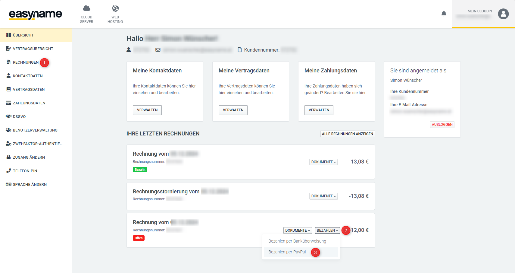 Navigate to My CloudPit → Invoices (1) and click Pay (2) on the open invoice. Then select PayPal (3).