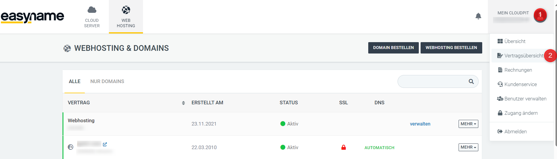 In Cloudpit, you can find the cancellation periods for the respective products in the contract overview. You can find the contract overview in your Cloudpit account under "Mein Cloudpit"(1) and the submenu item "Vertragsübersicht"(2)