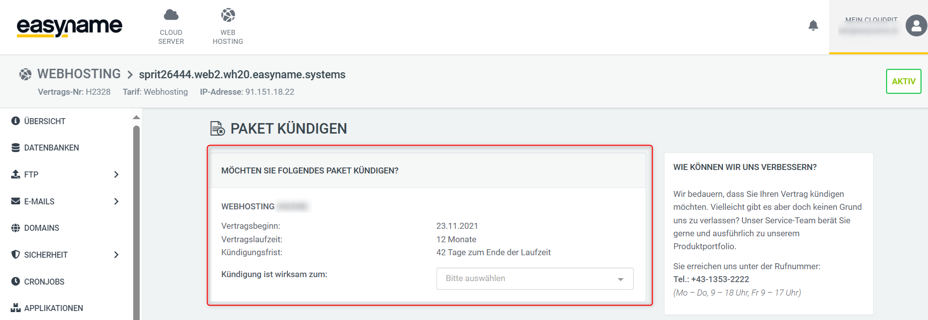You can find an overview of cancellation periods for new product purchases on our website easyname.at under the respective product group. Below you will find instructions on where to locate the cancellation periods for your existing products in Cloudpit and the easyname Control Panel.