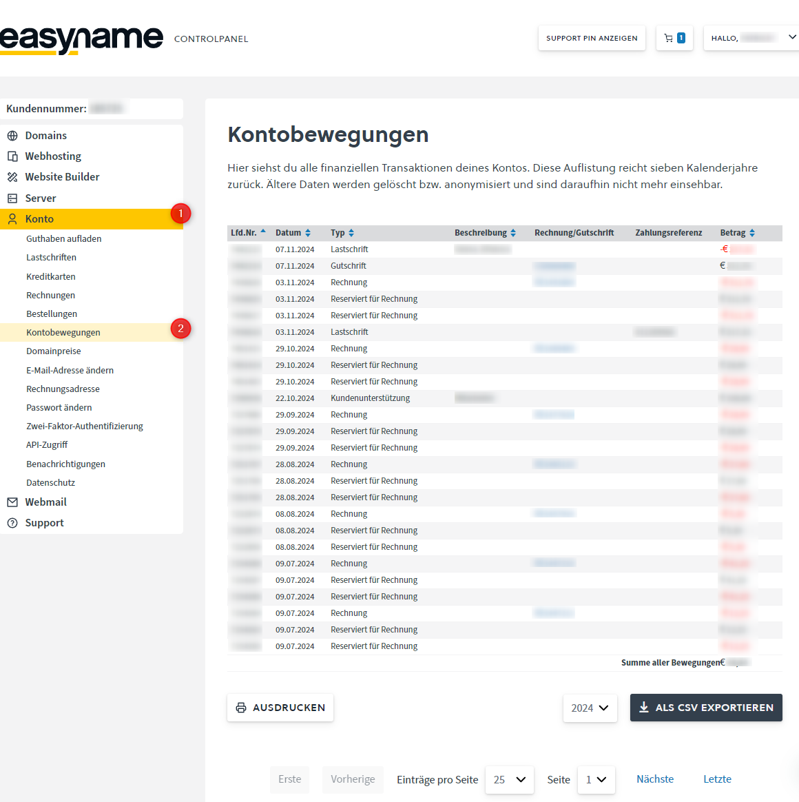 Here you will find a list of all financial activities in your account (e.g., deposits such as credit card payments or your past invoices), which you can filter by calendar year and also export or print as a .csv file.