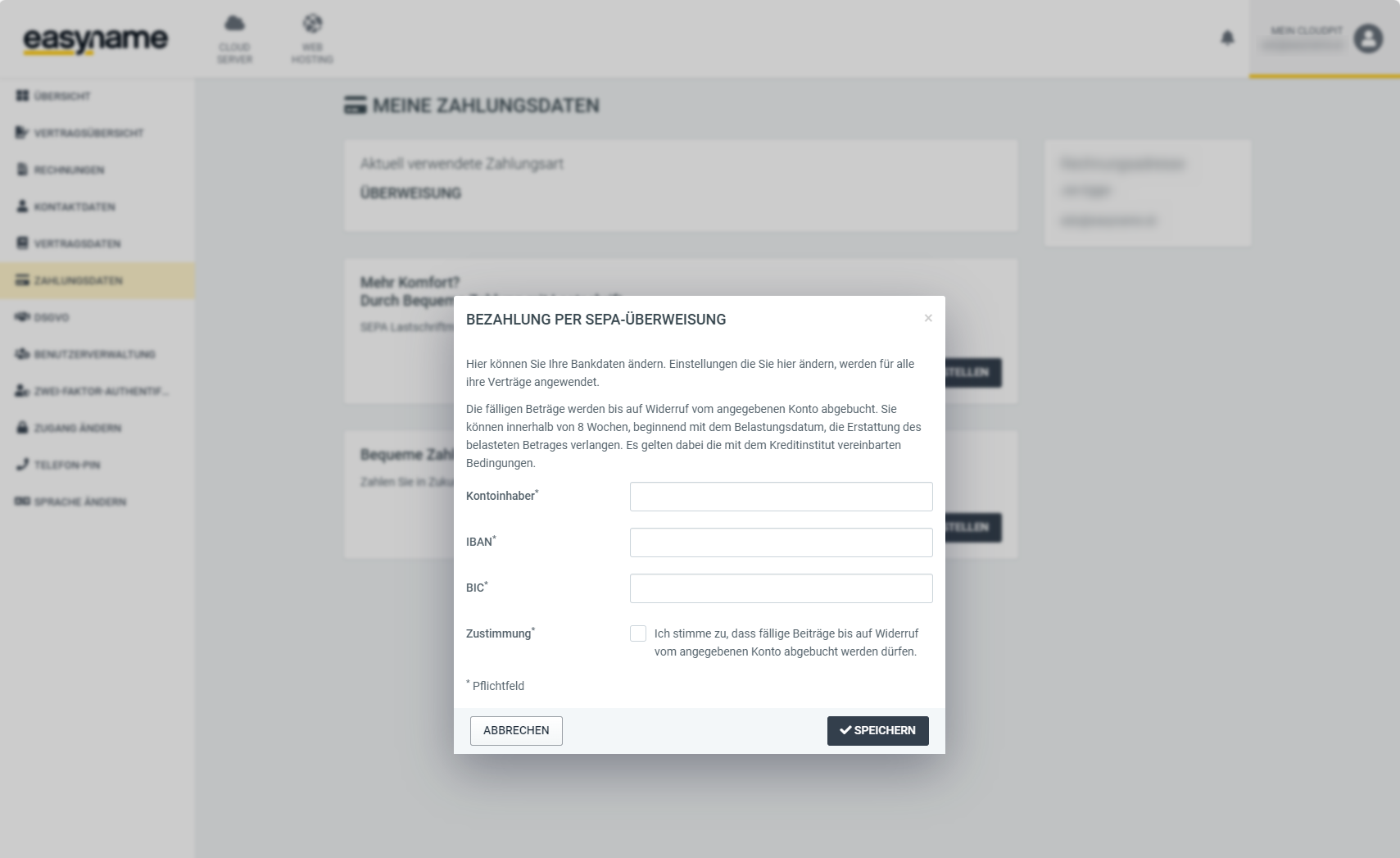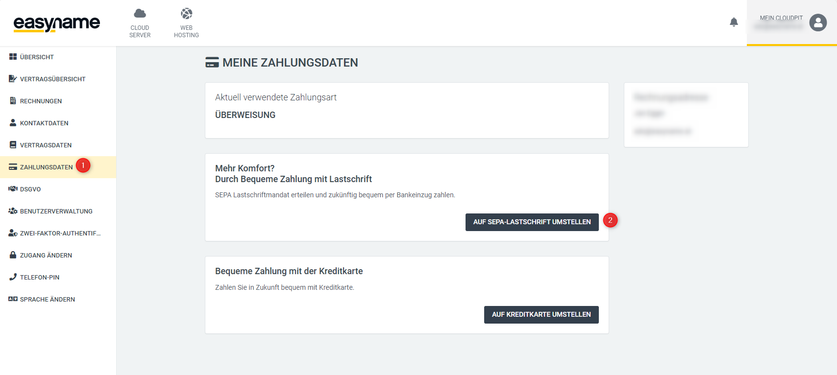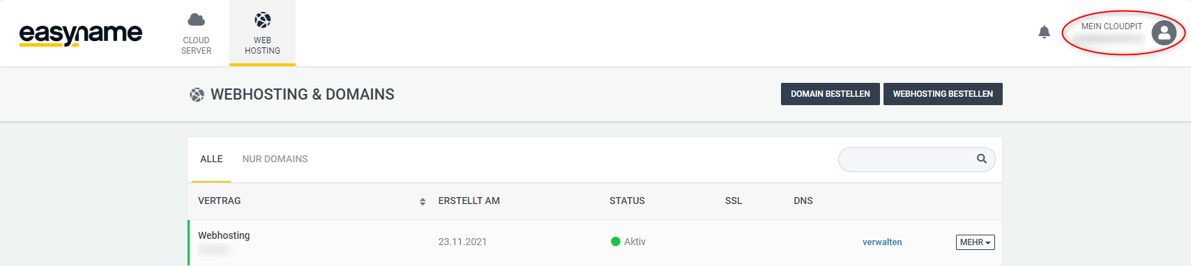 To add your bank account to your Cloudpit account, you must first log in Login | easyname. After you have logged in, first click on "Mein Cloudpit" at the top right to access the management overview of your account.