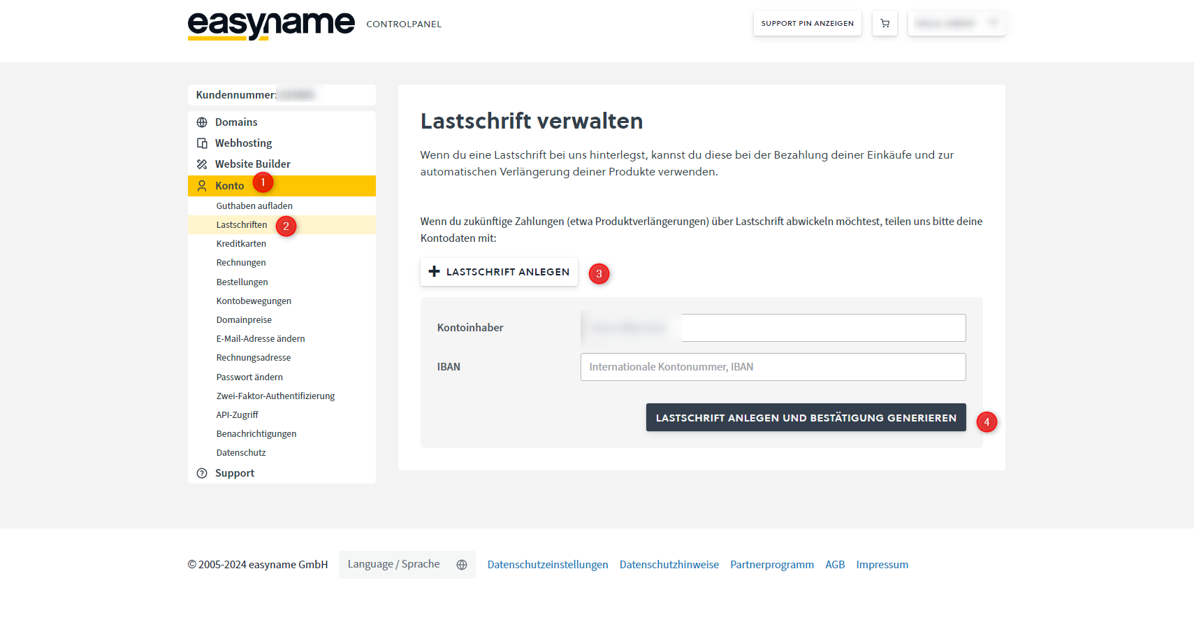 To add your bank account in your easyname Controlpanel, you must first log in Login | easyname. After you have logged in, click on "Konto" (1) in the left menu and then on the submenu item "Lastschriften" (2). Here you then click on "Lastschrift anlegen" (3) so that you can enter the IBAN and the account holder to be added. Once you have entered the data, click on "Lastschrift anlegen und Bestätigung generieren" (4).