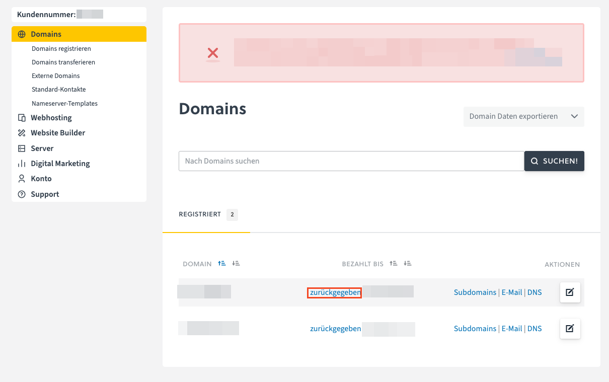 1.) Log in to your Control Panel and click on the [Domains] menu item. In the domain overview, click the blue "returned" link next to the expired (AT) domain.