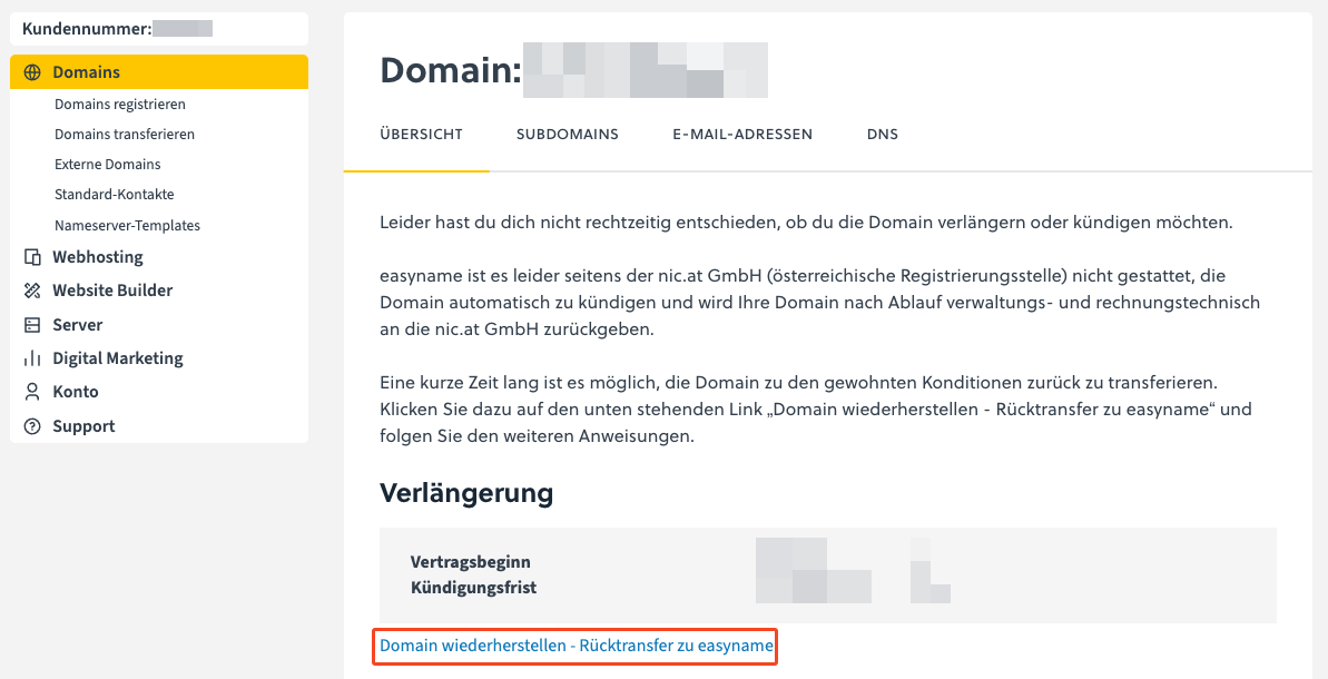 2.) Click on the blue highlighted "Restore domain - Retransfer to easyname" link.