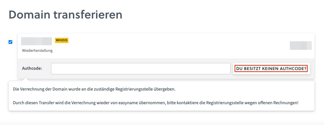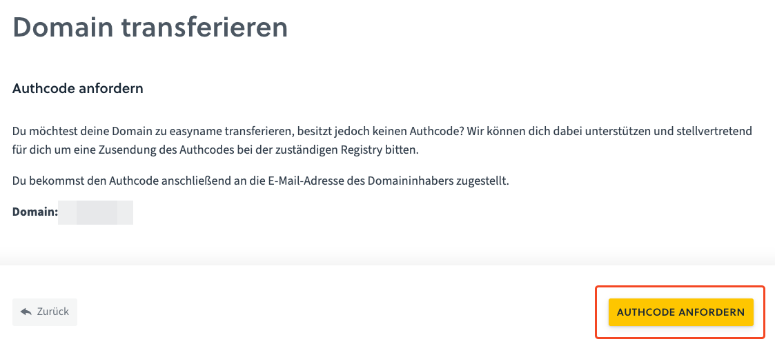 5.) After some time, you will receive the AuthCode by email. You can then enter it on the page under step 3 and start the transfer process by clicking "Add to cart". Once completed, the domain will be active in your account again.