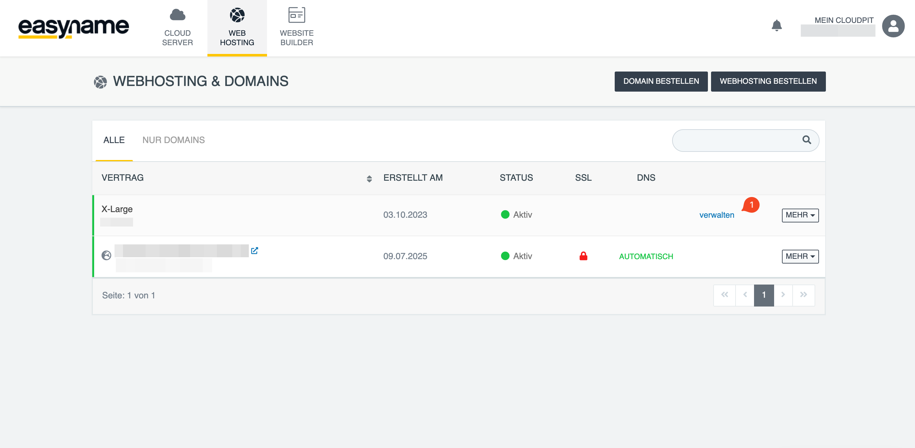 Click on manage (1) next to the desired hosting (alternatively via [MORE ⏷] → [Open management]).