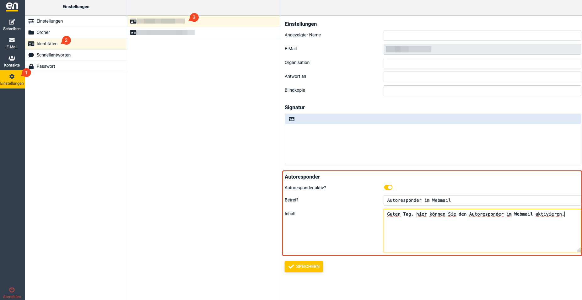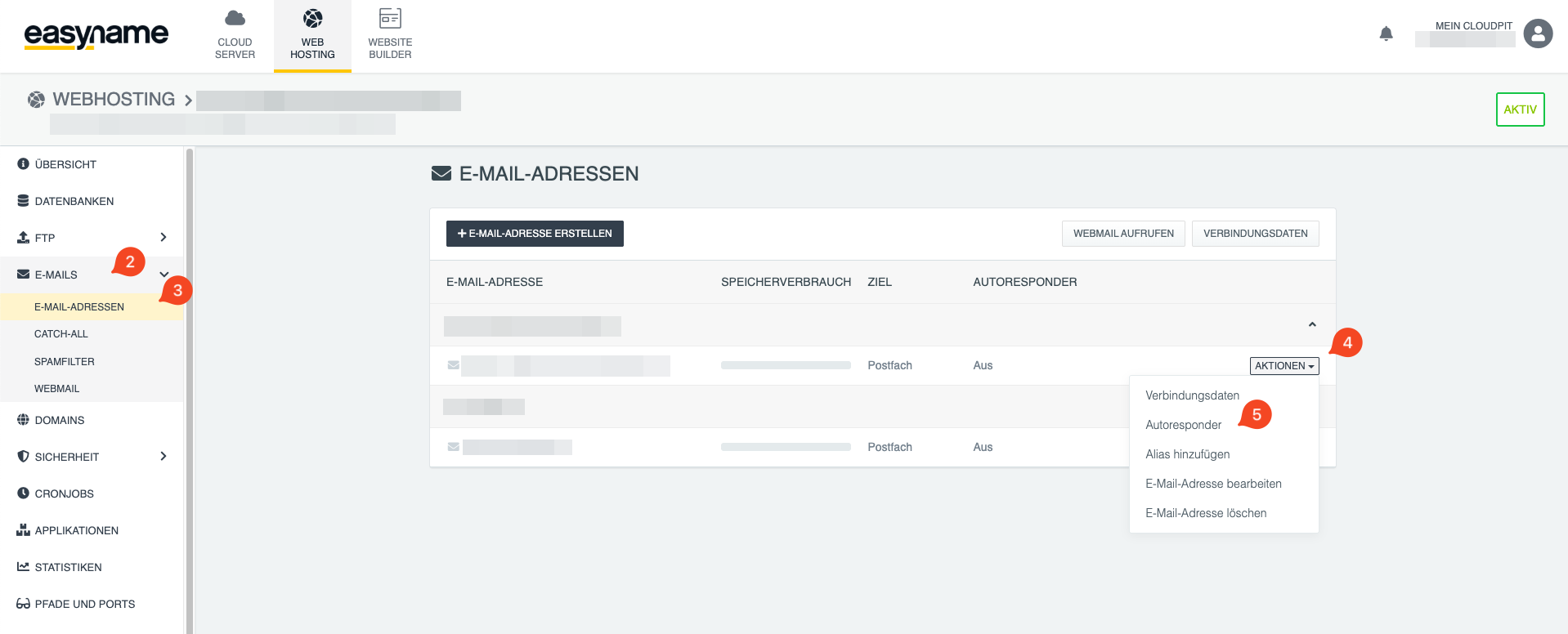 In the overview, search for the desired email address and click on [ACTIONS ⏷] (4) → [Autoresponder] (5) for that address.