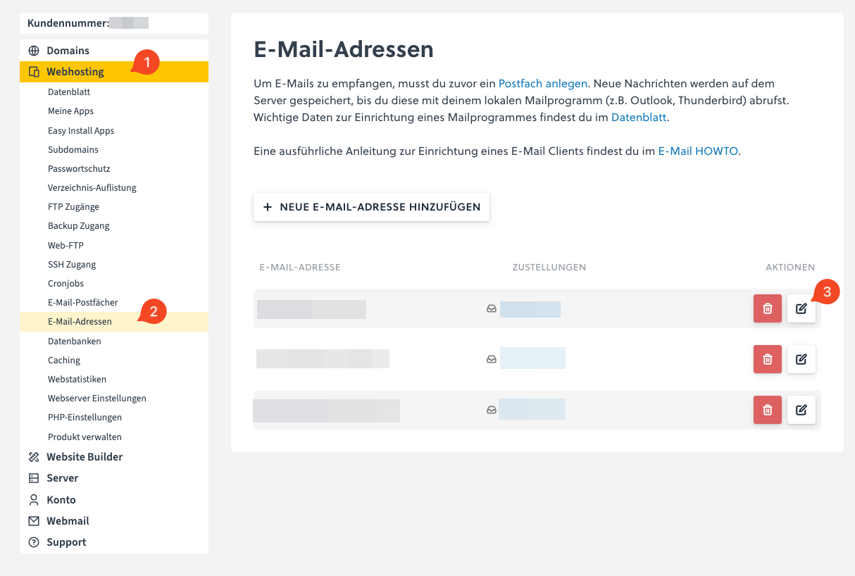 In the overview, click on the notepad icon ([Edit email address]) (3) for the desired email address.