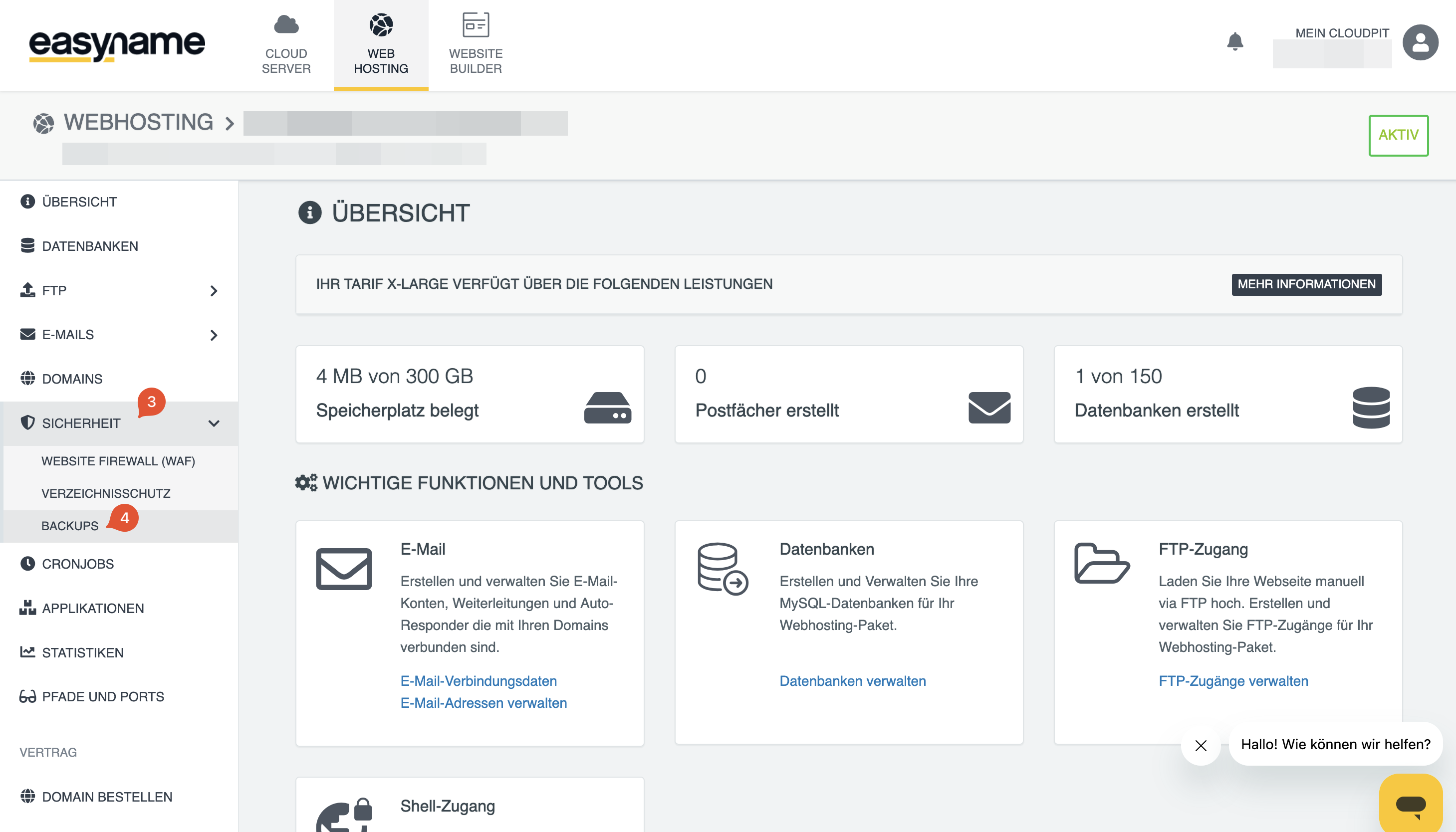 In your customer account, select the desired web hosting package and click on [Manage] (1) or via [MORE ⏷] (2) → [Open management].