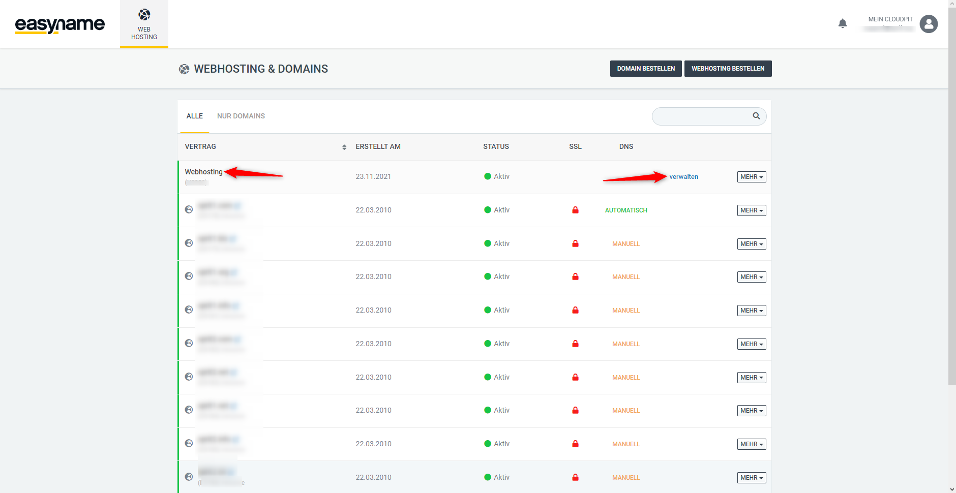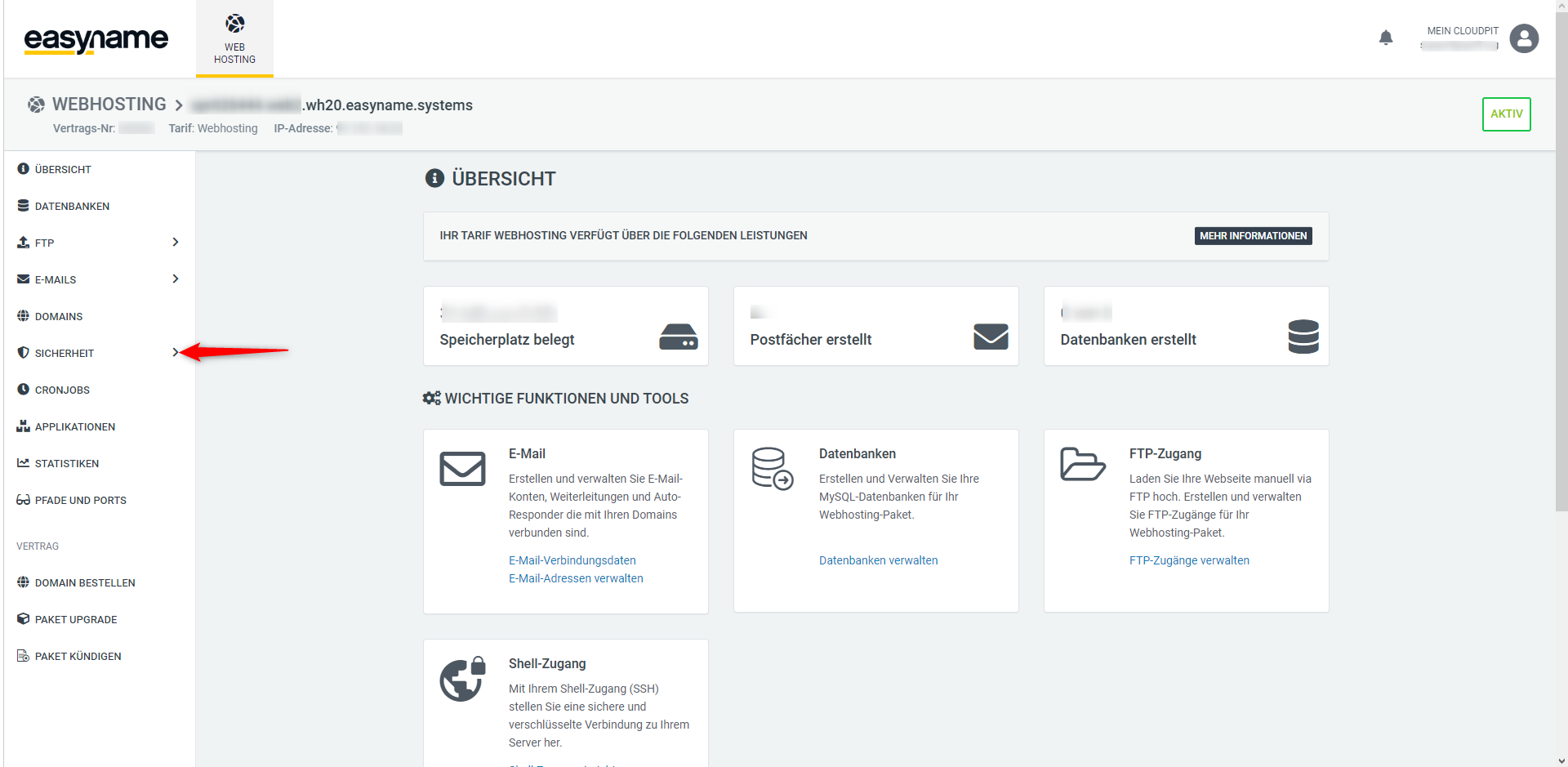 In CloudPit, open the Webhosting section.