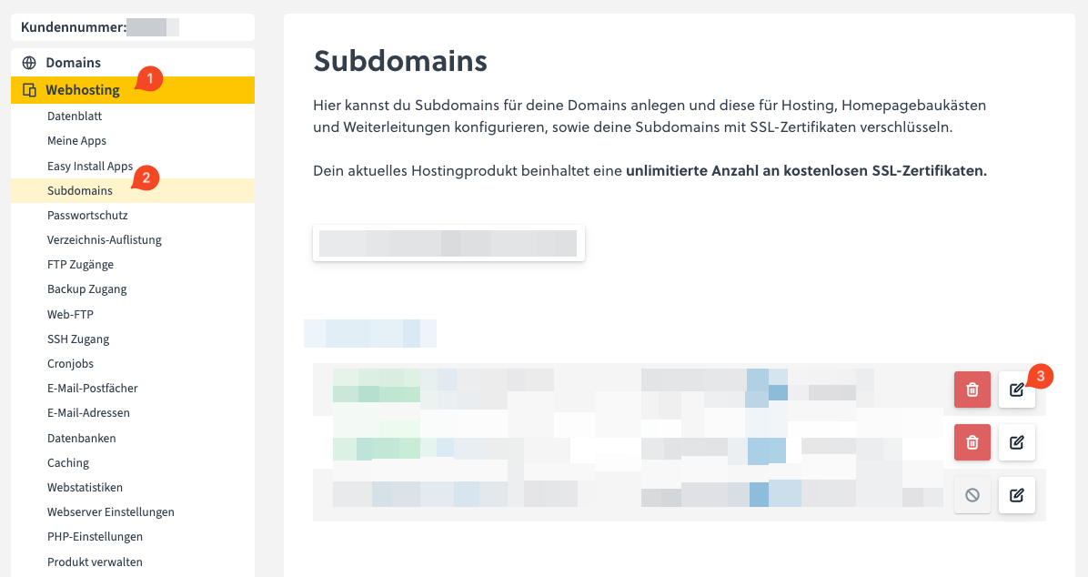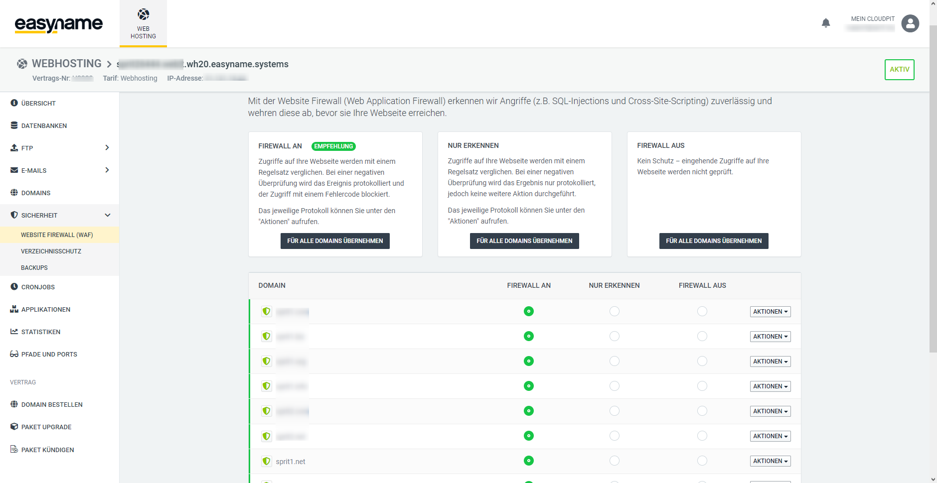 Here you see a list of all domains and subdomains of your web hosting. You can configure the firewall individually for each domain.