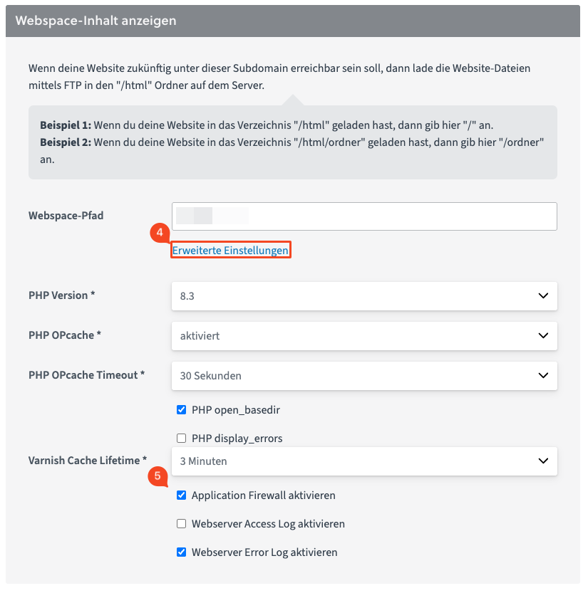 In the easyname Control Panel, you can specify whether the Application Firewall (WAF) is enabled or disabled by default for newly created subdomains.